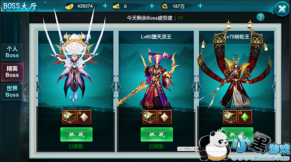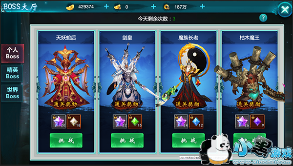 玩家每日可挑战3次个人BOSS,每个BOSS可挑战1次,个人BOSS按照玩家等级解锁,属于个人的BOSS,其他玩家不可抢夺。