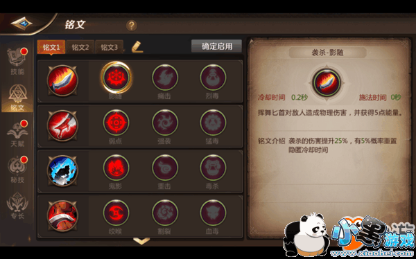 与铭文相似的是,天赋技能也可以分为暗杀系、鬼舞系和毒药系三个方向。暗杀系凭借超强的技能伤害和暴击击败对手,鬼舞系更侧重于控场能力,毒药系拥有各种不同效果的毒药,给敌人造成多种减益效果和不俗的持续伤害。