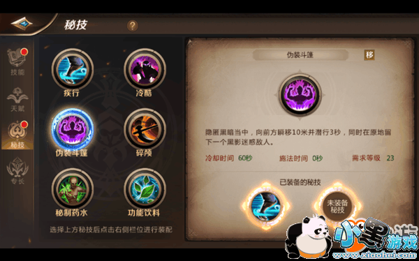 伪装斗篷:23级解锁,瞬发技能,冷却时间60秒。释放后刺客向前方瞬移10米并潜行3秒,同时在原地留下一个黑影迷惑敌人,是保命神技。