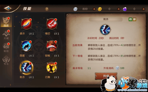 冷酷:18级解锁,瞬发技能,冷却时间60秒。释放后刺客下次攻击必定暴击。