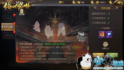 守护试炼的目的是要拯救被困的龙儿。该试炼会在大家84级时自动开启,每日可免费挑战2次。既可单人挑战,也可组队打本。进入试炼后,每隔一段时间就会有敌人向龙儿发起攻击,其中不乏实力强悍的BOSS级人物。而我们的任务就是击杀这些敌人,保护龙儿安全。若龙儿被击杀,则挑战结束。