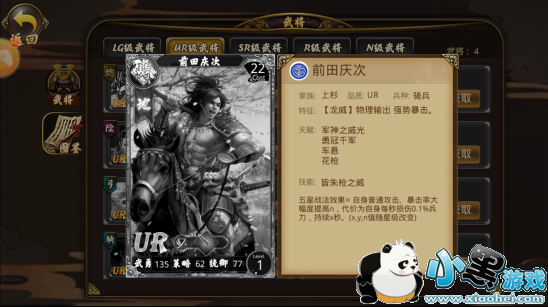 【前田庆次】:俗称自残菊花次~曾经jjc骑兵切后排的时代他是神将,现在版本一般,不过输出惊人,可以培养,天赋只能说还行,配本多的帽子比较厉害~