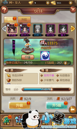 伙伴激活后,也可对其进行升级或升阶,等级越高、阶数越高均能提升伙伴的战斗能力。