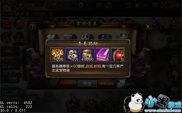 军团宝库会根据军团占领城池数量及规模产出各类宝箱,使用令箭即可进行夺宝,宝箱中会产出大量铜钱及粮草。
