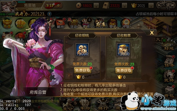 在府库中可征收铜钱与粮草,每成功收复一个城池,即可获得1次免费征收的次数,征收时还有一定几率使获得的资源翻2-3倍。免费征收次数耗尽之后,还可以消耗元宝进行征收。值得注意的是,游戏中会在固定的日期开放府库双倍活动,此时征收可获得双倍资源。
