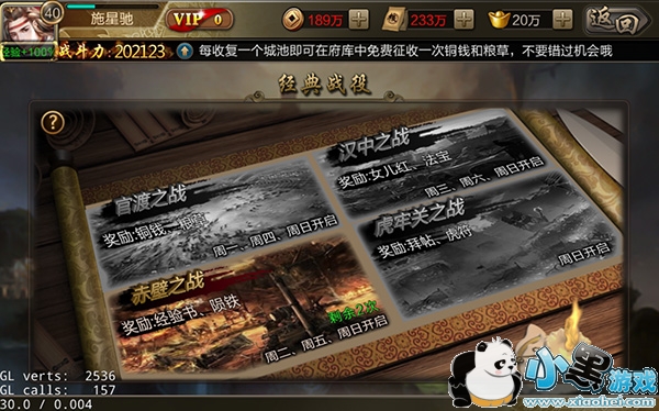 经典战役在每周一、周四、周日时开启官渡之战,成功挑战关卡后将获得大量铜钱与粮草奖励,机会不容错过。
