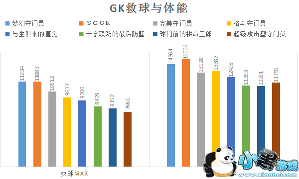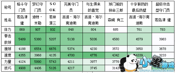 GK体力、拳击救球、接球、速度、力量、技巧最大值,总值如下图所示(注:数值大小由颜色深到浅排列。):