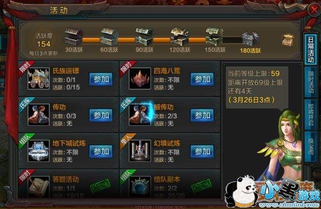 日常活动必做推荐:清源任务、组队副本、校场训练、令牌系列、降妖伏魔、女娲试炼。