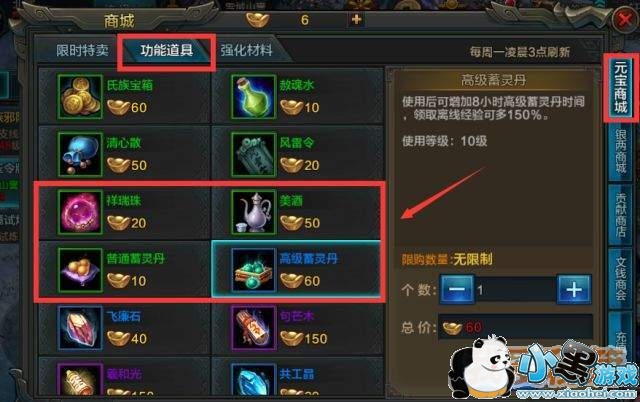 打开商城里的元宝商城,在功能道具上我们可以看到有4种经验加成的道具,分别是祥瑞珠、美酒、普通蓄灵丹和高级蓄灵丹
