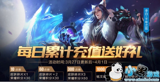 活动期间每日充值均可获得皮肤碎片、荣耀积分、大量铭文碎片等奖励,好礼送不停!