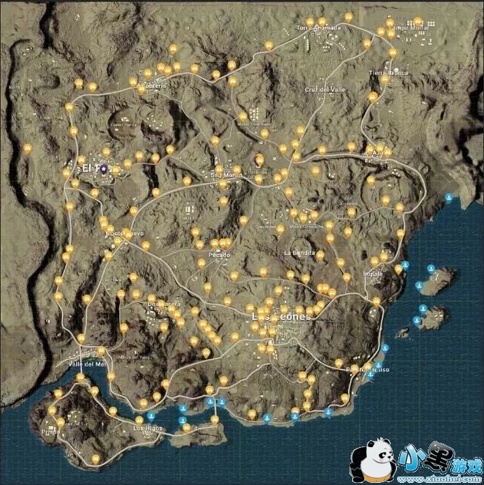 除了这些位置之外,其它的地点也有刷车的地方,下图是绝地求生刺激战场沙漠地图的详细刷车地点地图,大家可以用来作为参考。