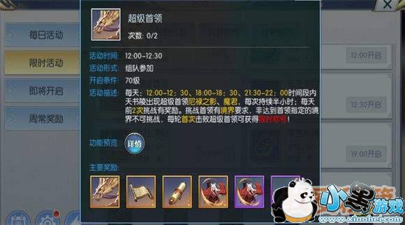 当我们的等级达到70级就可以参与每天的两次超级首领活动了,在12:00-12:30、18:00-18:30、21:00-22:00这三个时间段,天书陵会出现两个超级首领——尼禄之影和魔君,每次超级首领持续半小时,每天2次挑战有奖励。挑战首领需要达到指定的境界,所以现在道友们有了提升境界的一个新动力,那就是打超级首领。