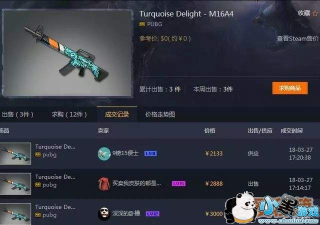 这个印花M16,就已经有多笔2000元以上的交易记录,最爆炸的是这个金色双管喷,概率极为稀有,卖方直接标价12000,但目前并没有人购买。