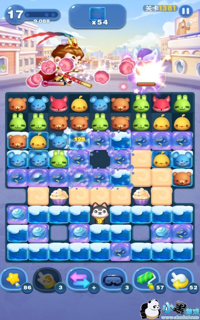 观察哈士奇身上的数字颜色优先消除,激活其中的一只哈士奇消除其周围的阻碍,这样就可以让小动物顺利的进入下方来到冰块的上方,这样一来只要消除小动物,冰块也会随之消除。