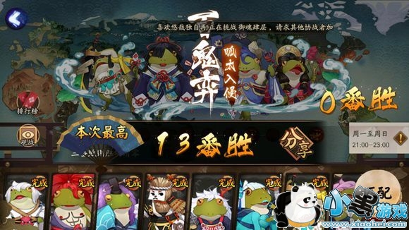 活动期间,百鬼弈替换为呱太入侵模式各位大人可以御使14只呱太装备特殊的四种御魂进行战斗同时新增呱太排行榜 ,每只呱太单独排行各位大人快来组建自己的呱太天团与其他大人一较高下吧!