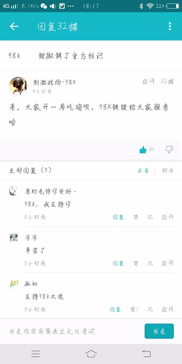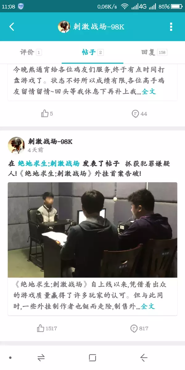 除了给全军出击刷好评以外,锅哥还声称是对面在自己的版块抹黑刺激战场,自己删帖太多了才发帖泄愤。