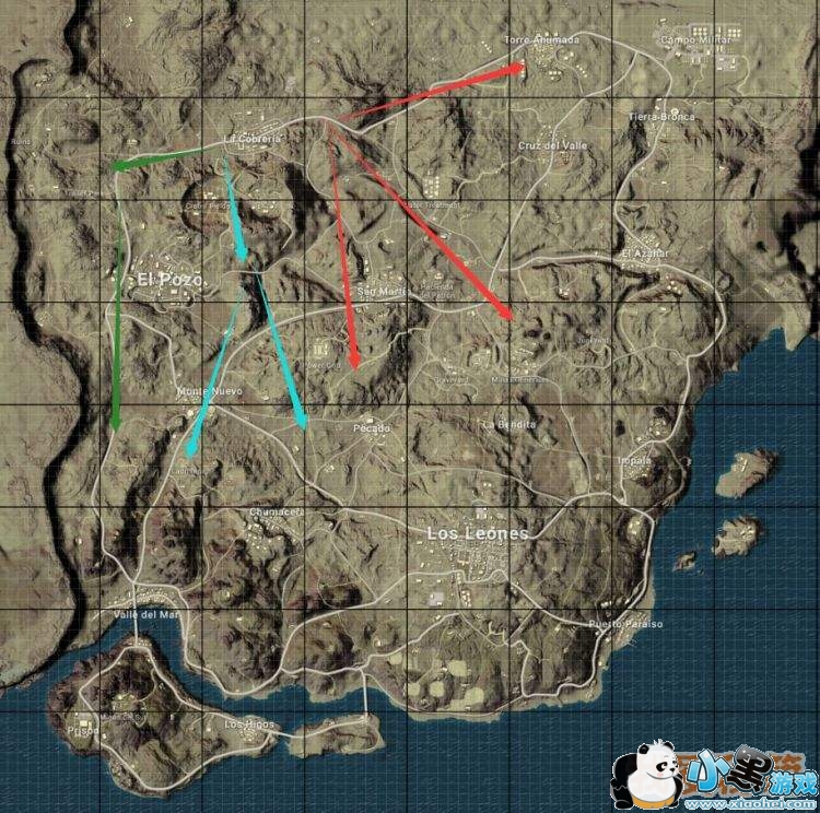 向地图右侧转移的话大多都会从红色的几条路线进圈,需要注意的是无论走公路还是山路,一定要避开圣马丁豪宅、水塔这几个地方,附近的野区也不要贪,经常会碰到打野的队伍。直接翻过南面高山穿过陨石坑平原向下转移,往西南方向的公路通往地图左下角,朝东南方向则会通往Pecado外的平原,相对而言不那么容易碰到人。而像绿色路线这样沿着大E城左侧的公路可以直接驶向地图左下角,如果是左边圈可以选这条路线,但小心路边野区有大E城出来的人,物资比较充裕的话可以直接占一个山头收过路费。