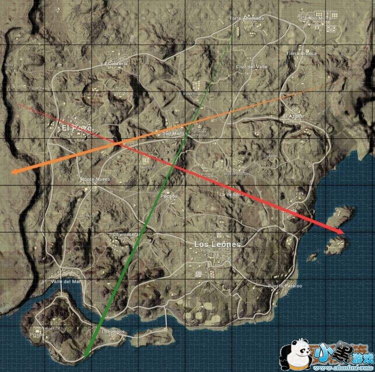 从大E城“El POZO”向下飞的航线,途径大E城、圣马丁豪宅和Pecado这些核心城市,我们则反其道而行之前往地图边界打野,相信不会有多少人喜欢这样打。反之飞机最终落点在大E城附近的航线,此时飞机上仅剩的玩家大多都是奔着大E城去的,基本不会有人愿意跟着我们去火车站干瞪眼,毕竟最后跳的都是发育流队伍。而上下贯穿地图的航线,虽然不能直接飘到火车站,但只要距离不超过2.5个大格,落地找车过去并不会耽误太多时间,更不会有人一起去。