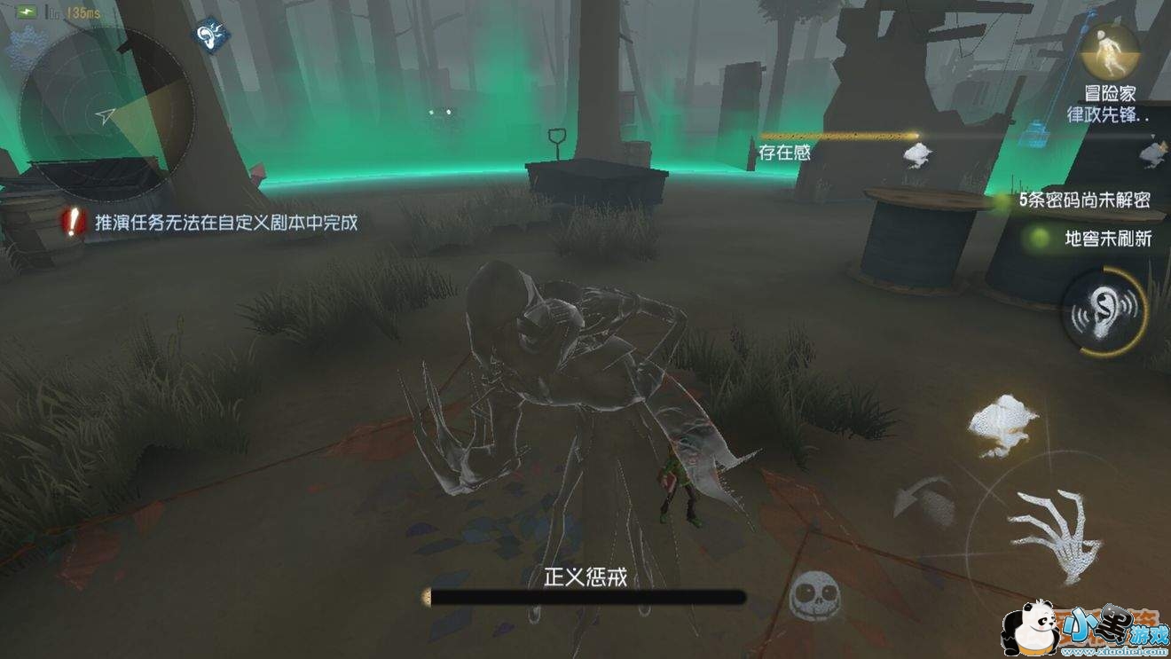 如图,正义惩戒释放有读条,40s读条120s的CD时间,且伴有非常明显的绿光提示,只有绿光里面的才会被拉进去。且正义惩戒不会打断杰克的隐身。读条完毕后可以将绿圈里面的所有人都吸到自己脚下并处于倒地状态。