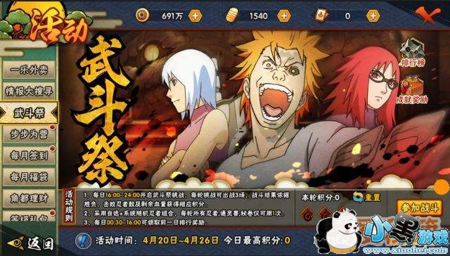 活动内容:学员每天挑选3-6名自己拥有的忍者,系统随机分配12个忍者,学员在这些忍者中选择9名忍者出战。每场选择3名忍者,总计参与3场对战,忍者不能重复使用,最后根据积分获得排名和奖励。