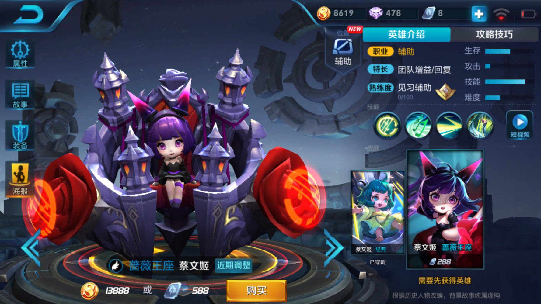 帮助范围内己方血量最少的英雄回血(超大量)。