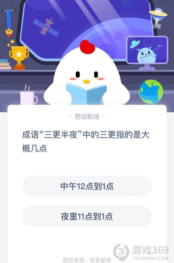 成语三更半夜的三更指的是几点,可能还有很多小伙伴不知道三更半夜里的三更指的是几点,下面就跟小黑游戏一起来看看今天的正确答案吧,选对答案的话就可以领取180g小鸡饲料了!