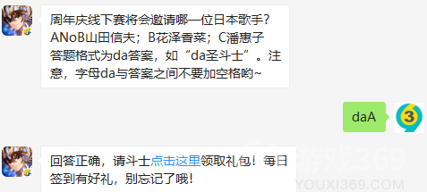 周年庆线下赛将会邀请哪一位日本歌手?ANoB山田信夫;B花泽香菜;C潘惠子8月29日圣斗士星矢每日一题的答案是什么?不知道的斗士们,进来看看正确答案吧!回答正确即可领取雅典娜为大家准备的丰厚奖励了