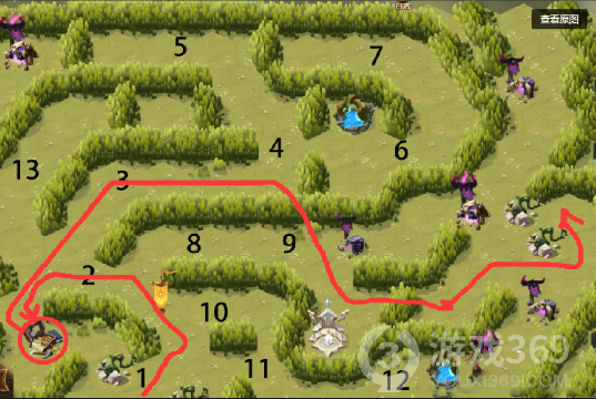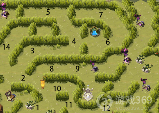 按照图中数字顺序清理14只怪,拿完14个BUFF和招2个绿裔队发以后去左边打绿裔队开草去右边二级绿裔队伍建议刷神器蛛丝手套和普攻叠毒,用一级英雄送死流磨血,最后用一队绿裔收尾。