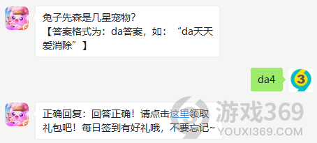 兔子先森是几星宠物?答案格式为:da答案,4月3日天天爱消除每日一题的答案是什么?不知道的喵粉们,进来看看正确答案吧!回答正确即可领取喵星星为大家准备的丰厚奖励了