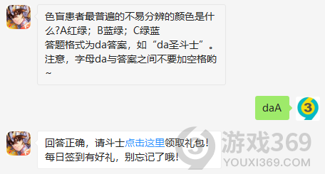 色盲患者最普遍的不易分辨的颜色是什么?答题格式为da答案,4月15日圣斗士星矢每日一题的答案是什么?不知道的斗士们,进来看看正确答案吧!回答正确即可领取雅典娜为大家准备的丰厚奖励了