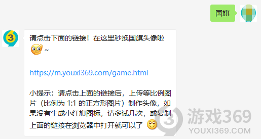 1、在“游戏369”(搜不到就搜:iyouxi369)微信公众号对话框回复【国旗】或【头像】,点击链接即可进入换微信头像。