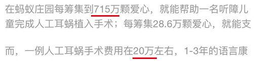 从其中一个公益项目的介绍中,可以看到 20万手术费用大约需要 715万颗爱心,