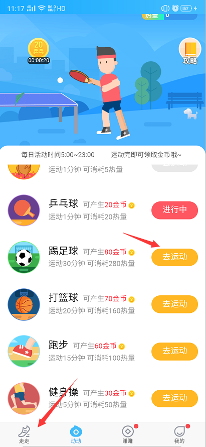 在【动动】界面点击每日活动任务的【去运动】按钮,每天5:00—23:00内,运动完即可领取金币。