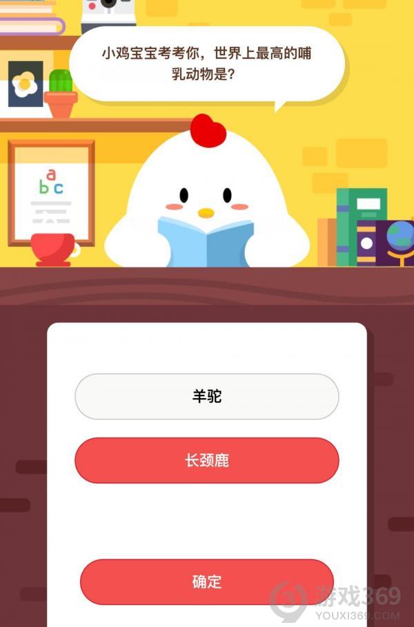 世界上最高的哺乳动物是?可能还有很多小伙伴还不知道世界上最高的哺乳动物是什么,下面就跟小黑游戏一起来看看今天的正确答案吧,选对答案的话就可以领取180g小鸡饲料了!!