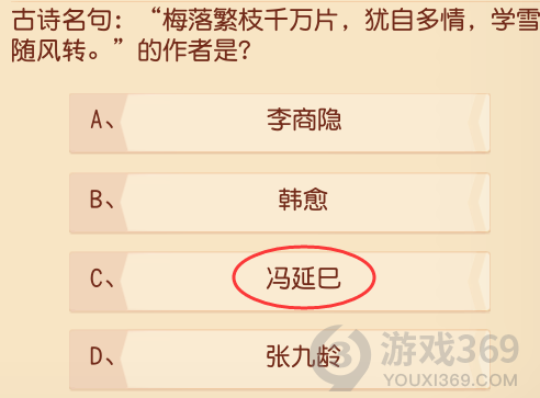 古诗名句梅落繁枝千万片犹自多情学雪随风转的作者是?梦幻西游三维版科举答题中问了这样一个问题,小黑游戏为大家带来正确答案,还不清楚的小伙伴们一起来看看吧~