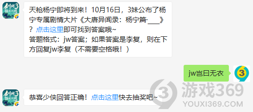 天枪杨宁即将到来10月16日3妹公布了杨宁专属剧情大片大唐异闻录杨宁篇?答题格式:jw答案,10月17日剑网3指尖江湖每日一题的答案是什么?不知道的少侠们,进来看看正确答案吧!回答正确即可领取3妹为大家准备的丰厚奖励了