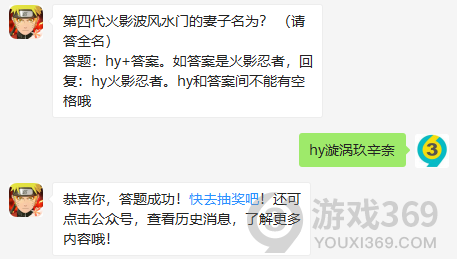 第四代火影波风水门的妻子名为?答题:hy+答案,4月11日火影忍者手游每日一题的答案是什么?不知道的学员们,进来看看正确答案吧!回答正确即可领取豚豚为大家准备的丰厚奖励了