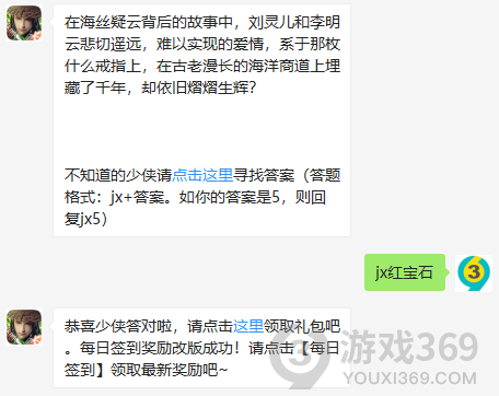 在海丝疑云背后的故事中,刘灵儿和李明云悲切遥远,难以实现的爱情,系于那枚什么戒指上,在古老漫长的海洋商道上埋藏了千年,却依旧熠熠生辉? 答题格式:jx+答案,5月4日新剑侠情缘手游每日一题的答案是什么?不知道的少侠们,进来看看正确答案吧!回答正确即可领取小师妹为大家准备的丰厚奖励了