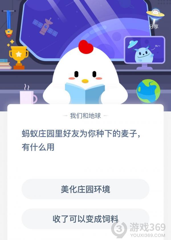 蚂蚁庄园里好友为你种下的麦子有什么用,可能还有很多小伙伴不知道蚂蚁庄园里好友种下的麦子有什么用,下面就跟小黑游戏一起来看看今天的正确答案吧,选对答案的话就可以领取180g小鸡饲料了!