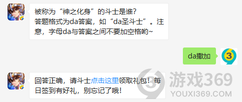 被称为神之化身的斗士是谁?答题格式为da答案,1月26日圣斗士星矢每日一题的答案是什么?不知道的斗士们,进来看看正确答案吧!回答正确即可领取雅典娜为大家准备的丰厚奖励了