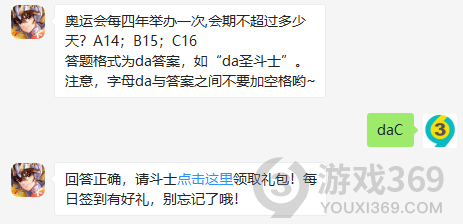 奥运会每四年举办一次,会期不超过多少天?答题格式为da答案,4月18日圣斗士星矢每日一题的答案是什么?不知道的斗士们,进来看看正确答案吧!回答正确即可领取雅典娜为大家准备的丰厚奖励了