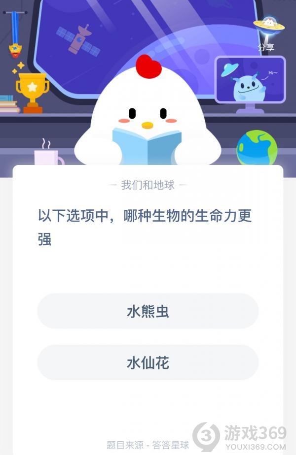 水熊虫和水仙花哪种生物的生命力更强,可能还有很多小伙伴不知道下面选项中哪种生物的生命力更强,下面就跟小黑游戏一起来看看今天的正确答案吧,选对答案的话就可以领取180g小鸡饲料了!