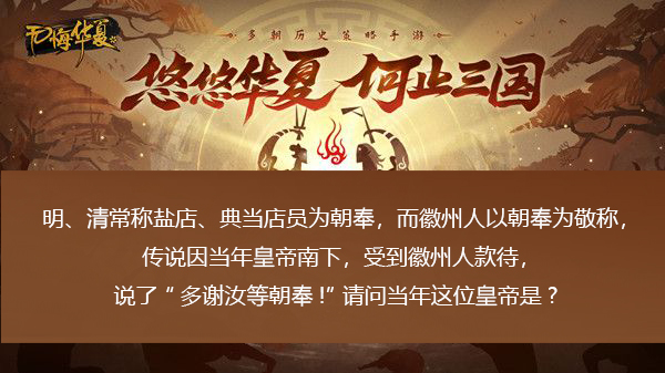“明、清常称盐店、典当店员为朝奉,而徽州人以朝奉为敬称,传说因当年皇帝南下,受到徽州人款待,说了“多谢汝等朝奉!”请问当年这位皇帝是?”是无悔华夏中渔樵问答活动2023.2.22的题目,都是与历史内容相关的哦,只要大家了解相应的内容就可以知道答案,所以大家知道答案是什么吗?下面来和小编看看吧。