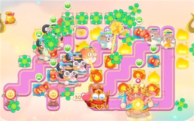 3、中后期阶段,地图中间及两侧的炮塔基本清理干净,剩下的小障碍物不值钱,右下方火瓶升级加强输出,中间多放鞭炮,阵容框架基本成型。