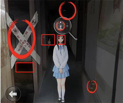 1、点击放大镜拖动至人脸,可以找到诡异的【人脸】,点击左边的封条,找到【封条】,右下角有【小熊】,后面有炸毛的【黑猫】,右侧墙下方有【字迹】,门边有一个【手印】,点击放大镜拖动至左下方土上,找到【土坟】,点击放大镜移动到封条上,找到【黄纸符】。