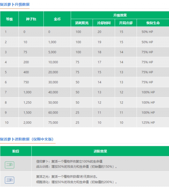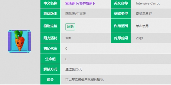 1.复活萝卜(Intensive Carrot)是《植物大战僵尸2》中即时使用的植物,可以复活被僵尸吃掉的植物。