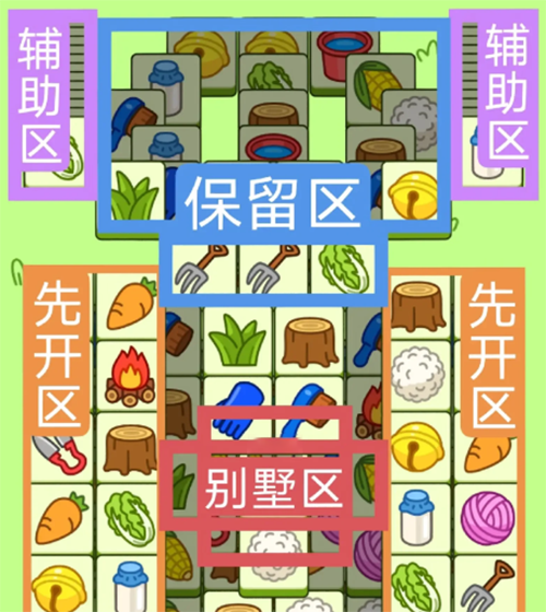 3.必要时可以用紫色盲盒区辅助消除,盲盒区后期不用留太多,留几张备用即可。