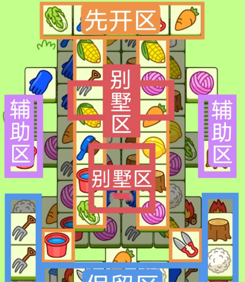 一个十字型大别墅,开局先消除橙色区,这里压牌此较多。然后按照一层层均匀消除表面牌,不要跨层太多拿牌,必要时可以用盲盒区辅助消除表面牌。尽量还是以别墅区内互相消除为主,蓝色区基本都是明牌,全部保留到后期
