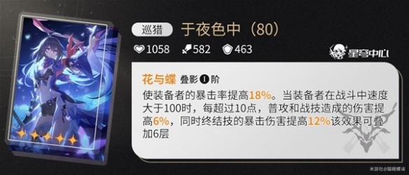 光锥就是本游中的武器,希儿的毕业光锥是【于夜色中】,需要160点速度启动所有加成,不过这对希儿来说算不上什么难题。从伤害层面上来讲这个是绝对的最佳选择,光是1阶就有18%暴击率以及36%战技通用加成和72%大招暴伤加成,远远甩开其他下位光锥;不过这个光锥并不止希儿能用,其他巡猎角色只要能堆一点速度那么就都能用这个光锥,通用性极高,如果资源足够的话肯定是推荐各位去抽一个的。