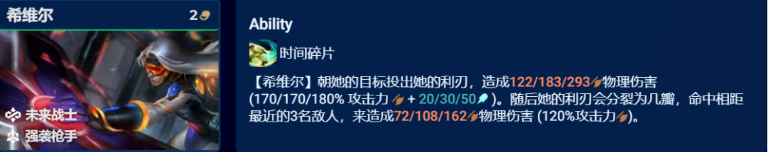 单看希维尔输出其实只是一般偏上,但搭配上5/7未来羁绊阵容强度就能获得史诗级提升。5未来就能召唤出两个复制体,通常选择潘森与希维尔,且未来召唤出的在3个符文后复制体就能携带3件契合的装备。召唤出的希维尔很多时候攻击力是比希维尔还高的,输出同样爆炸。而前排还能多召唤一个3装备的潘森,有装备哪怕被削弱45%生命值的潘森,也能抗很久,大幅度的增强了阵容的坦度。但不建议在未来两个格子都是前排的时候玩,有未来转职除外。